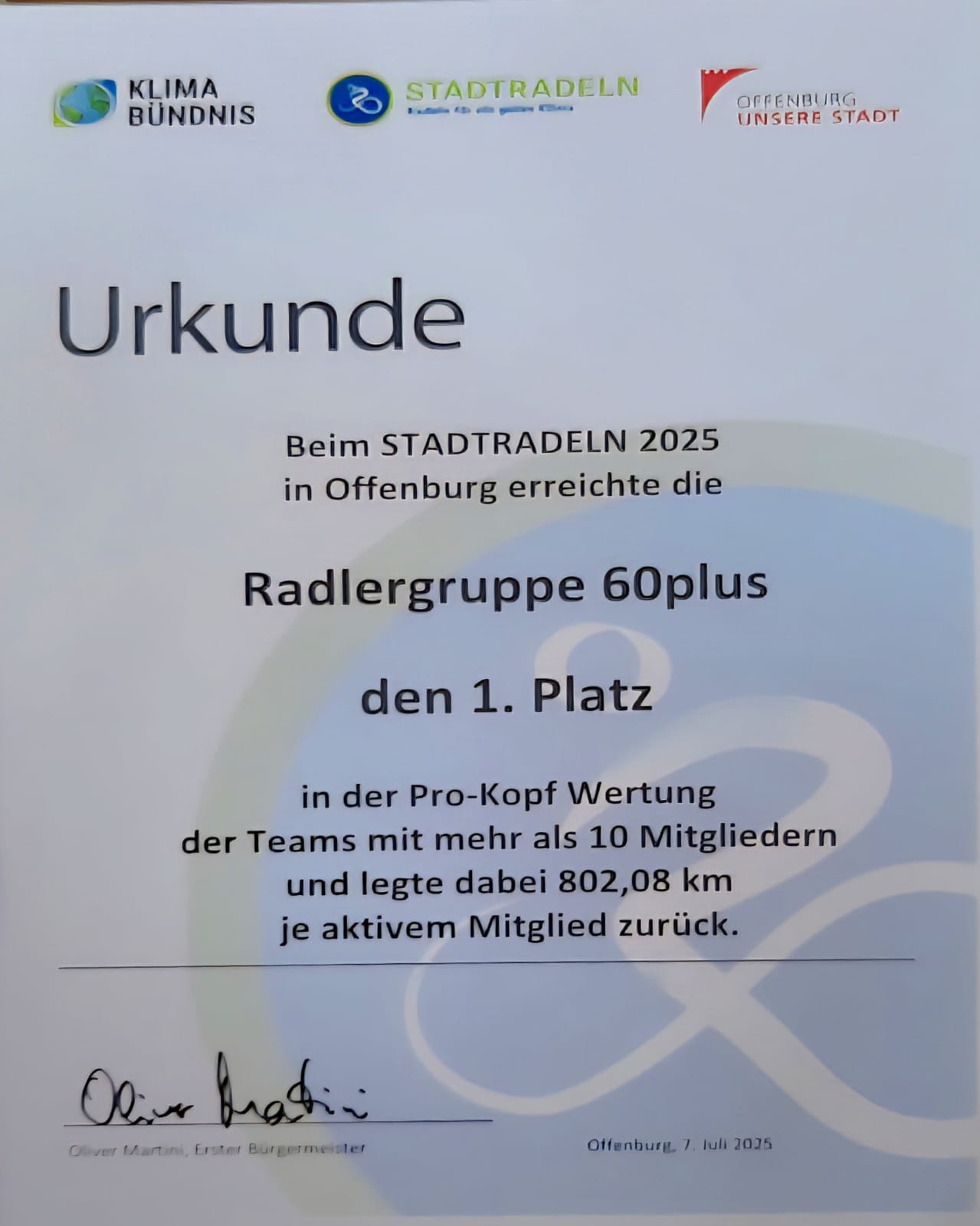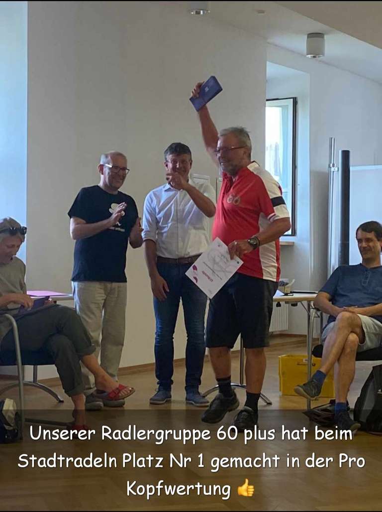 Unser Team "Radlergruppe 60 Plus" erreichte 2023 beim STADTRADELN mit 732 km je aktivem Team-Mitglied den ersten Platz in der Pro-Kopf Wertung